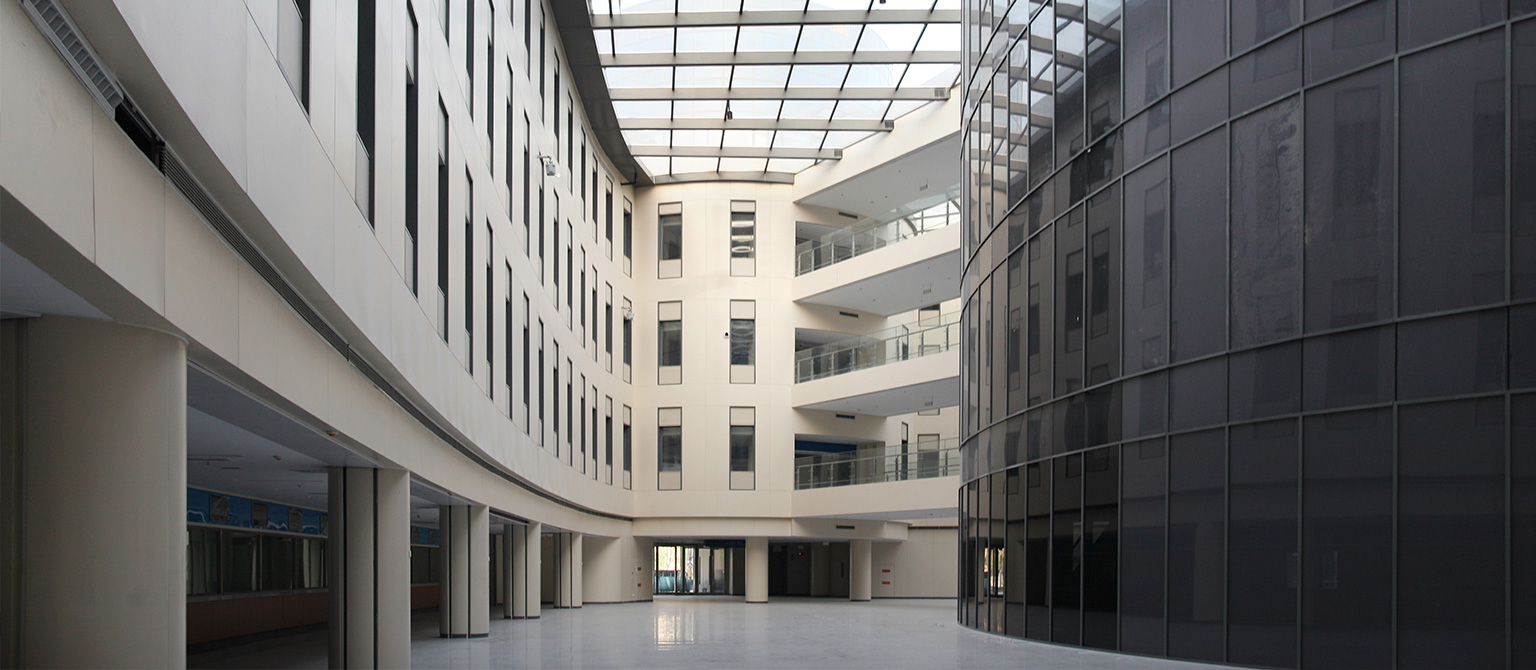 天壇醫(yī)院A1門診樓是鋼框架加支撐的結(jié)構(gòu)體系,平面是內(nèi)圓與外環(huán)通過三道連橋連同的造型。外環(huán)輪廓是圓形與等邊三角形的融合,直徑約80m,結(jié)構(gòu)沿徑向滿布兩跨框架。中間的圓形大廳直徑26m,根據(jù)建筑需要,中心是一個(gè)直徑18m的圓形無(wú)柱空間,通過三相框架梁互相搭接形成。內(nèi)外連接通過三道跨度14m的鋼橋連接,并形成三個(gè)大中庭空間。