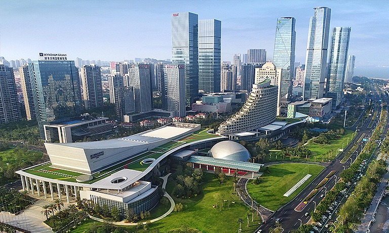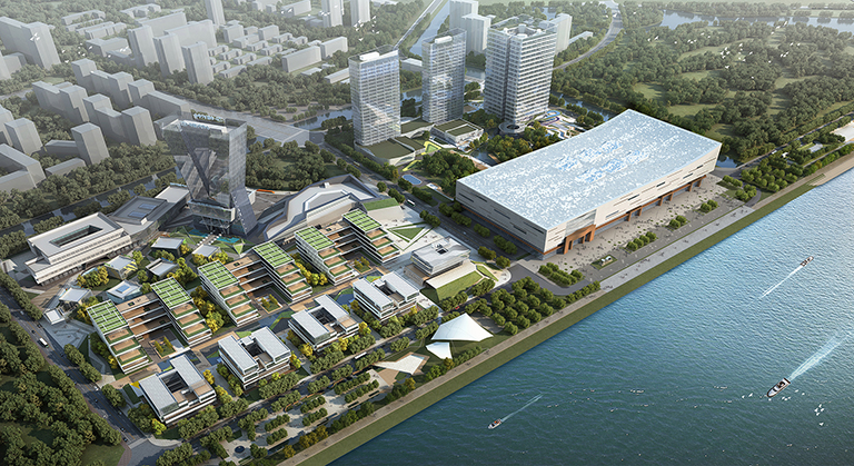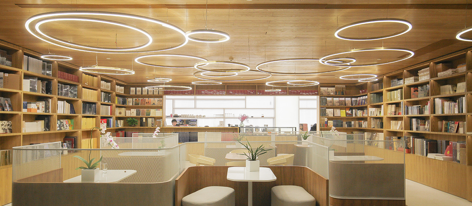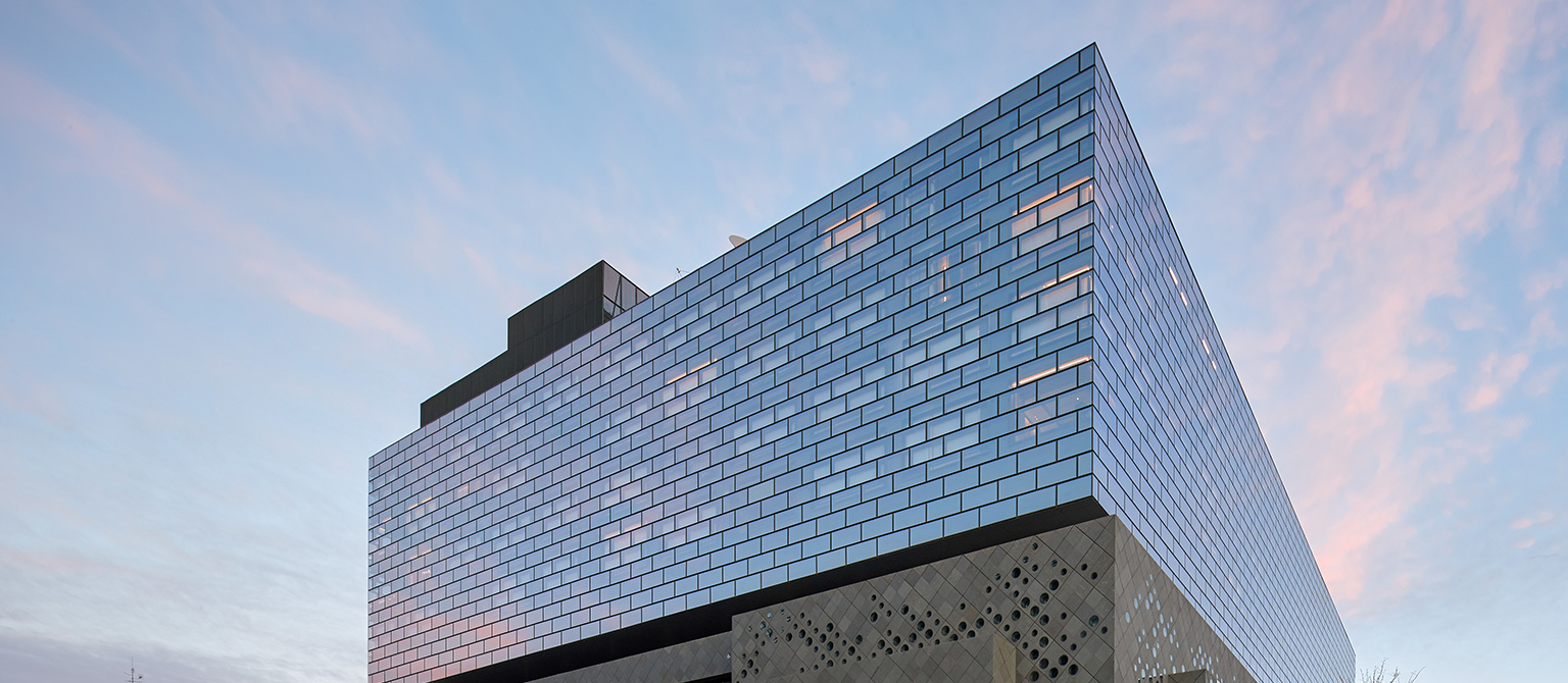 外幕墻首層至四層為菱形間隔單元式石材幕墻系統(tǒng),上部4-8層外立面為錯(cuò)縫玻璃幕墻預(yù)制型小單元系統(tǒng)。圓形雙面玻璃鏡筒內(nèi)置LED燈鑲嵌在深灰色石材幕墻上,抽象的呈現(xiàn)了中國元代畫家黃公望的富春山居圖。