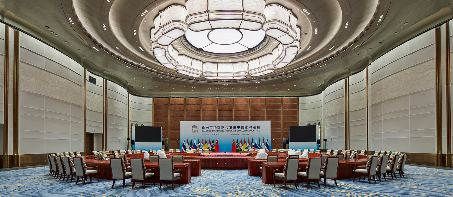 本項(xiàng)目改造設(shè)計范圍作為國家級重要會議的主會場、主宴會廳及附屬空間,順利承辦2017年金磚國家領(lǐng)導(dǎo)人第九次會晤及相關(guān)其他會議。