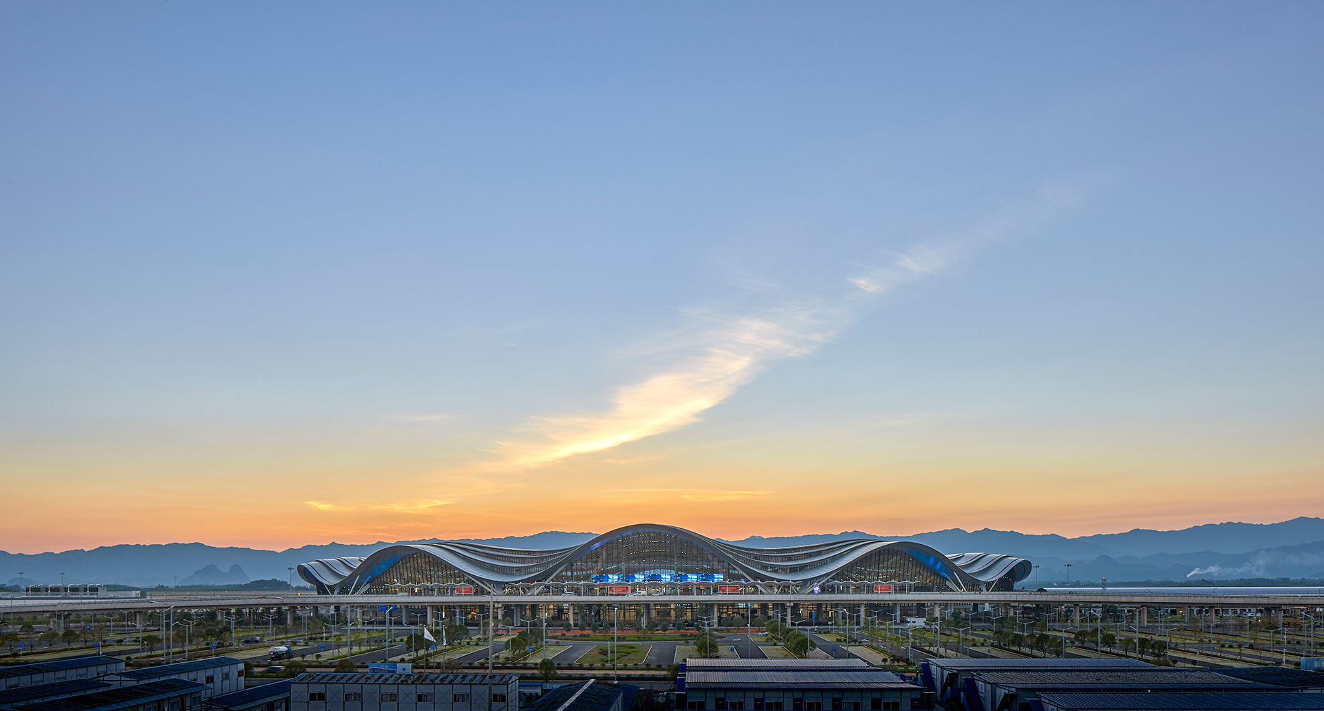 桂林被冠以 “國際性旅游航運樞紐”等眾多頭銜,本項目作為廣西壯族自治區(qū)成立70周年重點項目之一,承載了城市新門戶和帶動經(jīng)濟增長的重大責任。在用地緊張、容量目標壓力巨大、與現(xiàn)狀銜接難題的背景下,采用單一空側(cè)、貫穿式陸側(cè)及新樓與老樓平行式發(fā)展格局,南端開放保留下一期建設(shè)靈活性,北端與T1航站樓在空陸側(cè)進行緊密便捷銜接,最大限度節(jié)省用地為遠期發(fā)展預留更大靈活性,并為T1與T2航站樓協(xié)同運行提供最大便利。