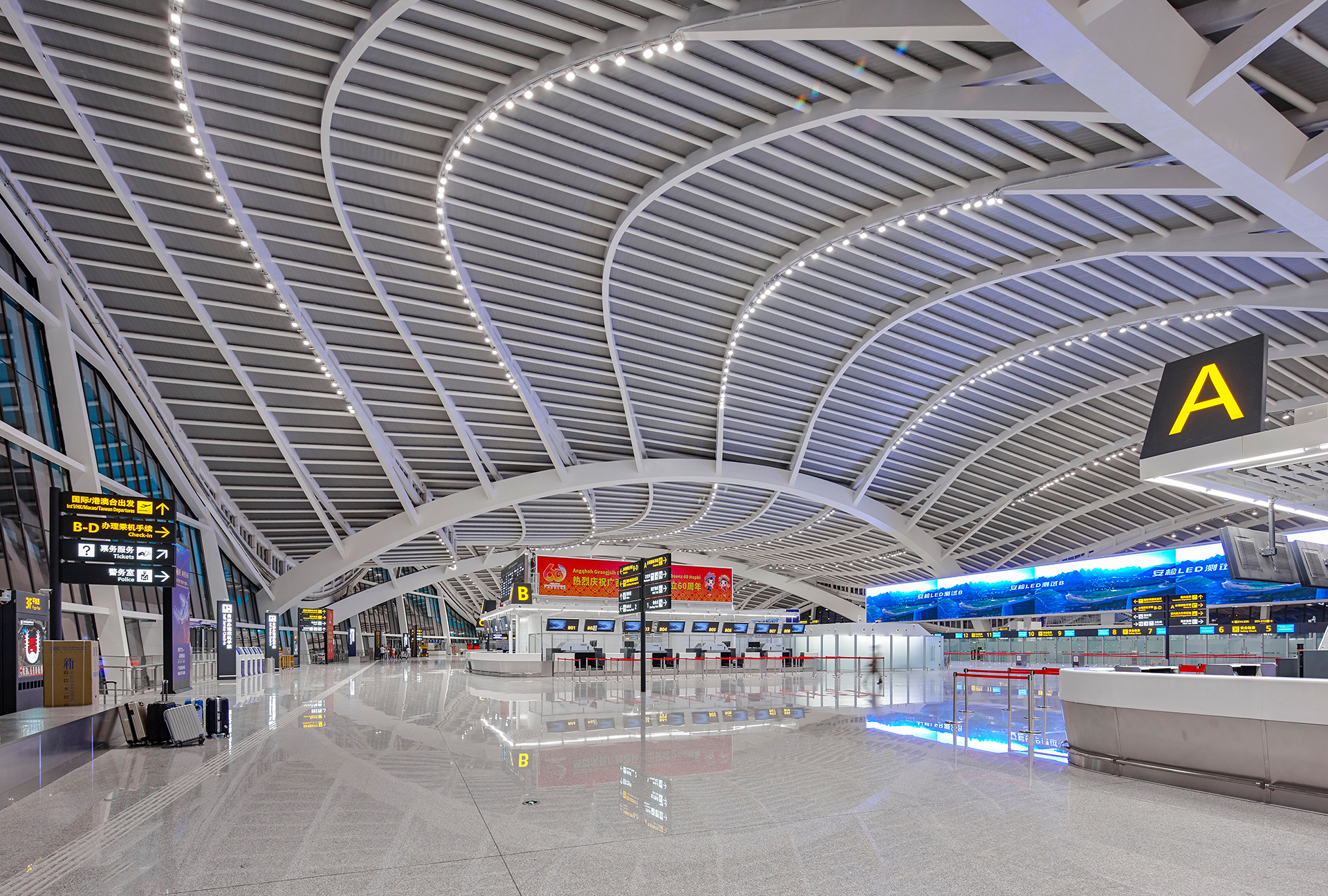 本項目五個連續(xù)起伏的拱形曲面與建筑內(nèi)部空間序列對應,成對的傾斜拱形支撐實現(xiàn)整個離港層大跨度的連續(xù)無柱空間。豎向分格的超白玻璃幕墻沿建筑立面展開,首層采用氟碳噴涂鋁單板幕墻。屋頂采用單層拱殼結(jié)構(gòu)以多榀傾斜拱為骨架,,頂部覆蓋金屬屋面系統(tǒng),通過建筑結(jié)構(gòu)一體化設(shè)計,結(jié)構(gòu)構(gòu)件直接成為室內(nèi)裝飾要素。屋面創(chuàng)新采用輕型金屬屋面與卷材防水和金屬裝飾板結(jié)合的屋面構(gòu)造系統(tǒng),實現(xiàn)了結(jié)構(gòu)底板作為裝飾板、屋面防水與裝飾雙層構(gòu)造等多方面的創(chuàng)新,并申請相關(guān)專利,實現(xiàn)了良好的防水性能及自然的金屬質(zhì)感和連續(xù)平滑的曲面效果。