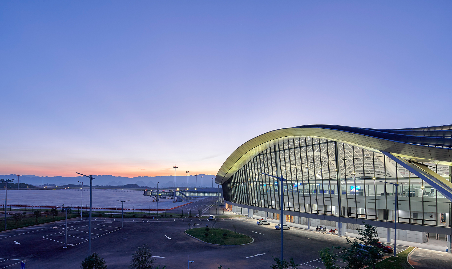 廣西桂林國際機場T2航站樓,為廣西壯族自治區(qū)面向“一帶一路”的重點建設(shè)項目。航站樓總面積約十萬平米。地上三層,地下設(shè)置一層管廊層。建筑為U字型布局,東西長約353米,南北寬約372米。建成后旅客年吞吐量850萬人次。
