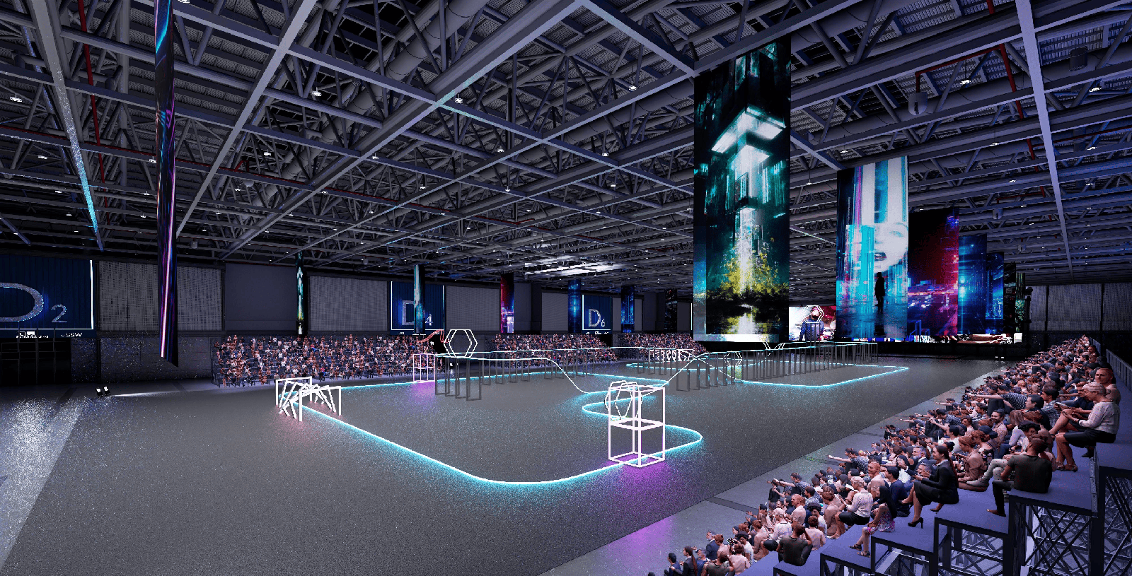 項目場地南側為既有建筑改造,包括A館展廳、B館展廳、C館會議中心、生態廊道,以及B、D館之間和A館南側卸貨區。場地東北側D館部分利舊,東側配套服務樓拆除并新建為無柱展廳。場地西側新建部分(登錄廳、會議中心)設置主入口及入口廣場。