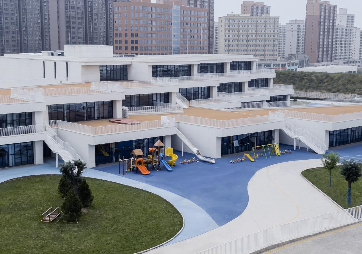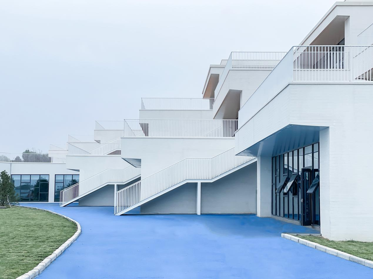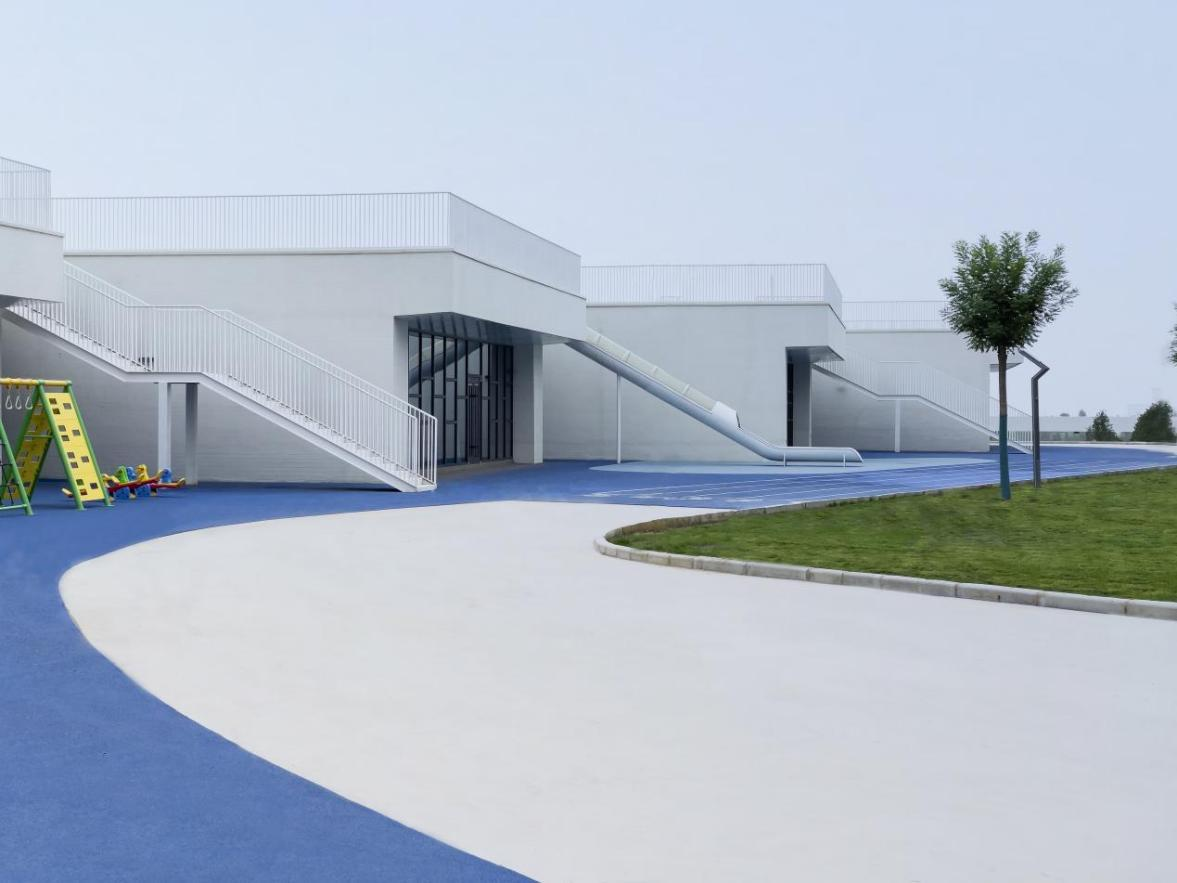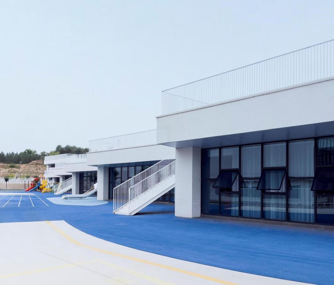 建筑外立面采用白色真石漆作為核心飾面材質,輔以白色金屬欄桿,形成簡潔統一的建筑風格。場地內的綠色草坪與藍色橡膠跑道色彩層次豐富,既注入自然生態氣息與活動活力,又與建筑外立面形成材質、色彩的和諧呼應。設計以兒童行為需求為核心,打造開放通透、安全舒適的學習活動場所,孩子們在這里自由玩耍、釋放天性。