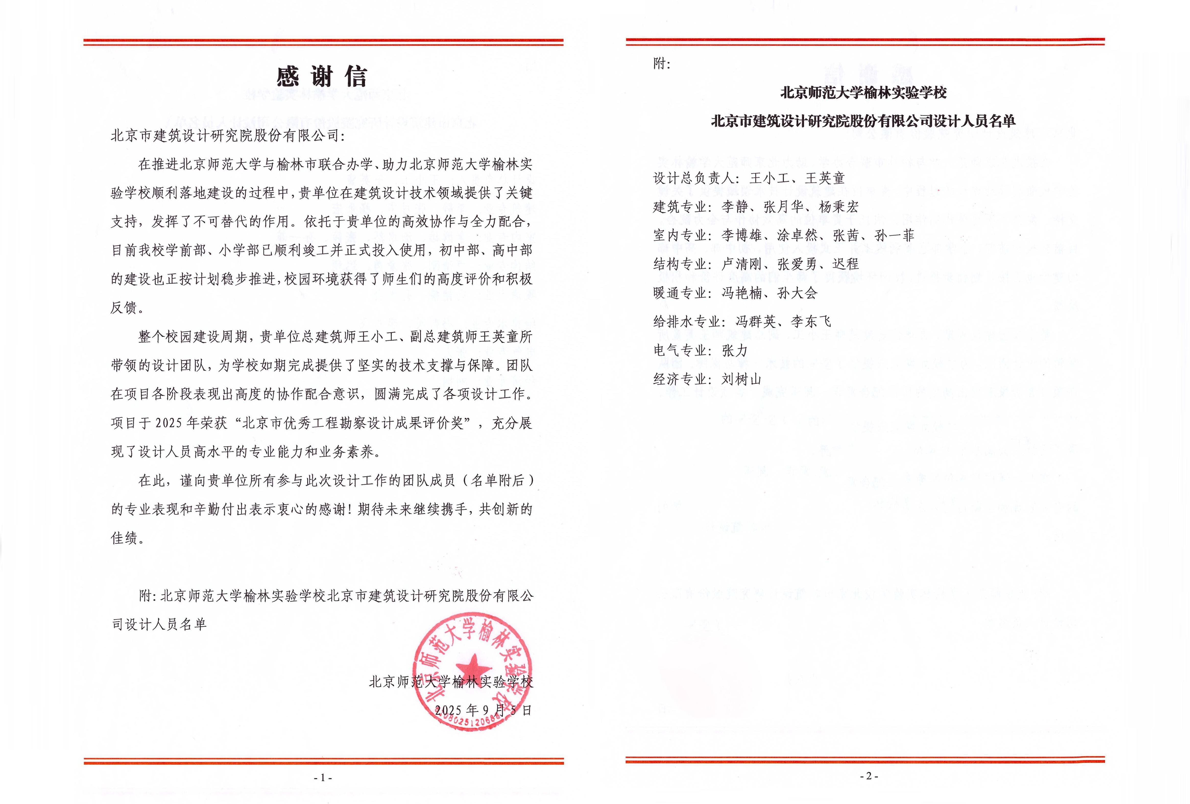 信中對北京建院設計團隊在推進北京師范大學與榆林市聯合辦學、助力北京師范大學榆林實驗學校順利落地建設過程中的專業表現和辛勤付出表示感謝,并向項目榮獲“2025年北京市優秀工程勘察設計成果評價獎”致以祝賀,對設計人員在整個校園建設周期,展現出的高水平專業能力和業務素養給予充分認可。