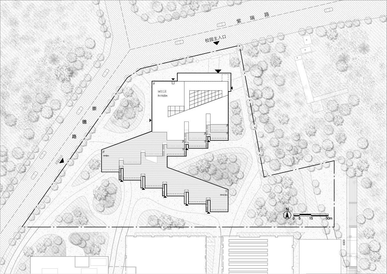 項目位于陜西省榆林市,場地南鄰科創四路,東至居然路,西至規劃道路,北至紫瑞路。項目用地不規則,設計團隊最大化地利用場地完成總體布局,主入口設置在北側道路上,西側道路設置應急出入口,南側緊鄰北京師范大學榆林學校小學部地塊,東南角地形高差較大,考慮到土方平衡,利用場地現有地形高差打造梯田式實踐園地,將園區綠地景觀與教育理念相結合,同時也完成幼兒園和小學的景觀銜接。