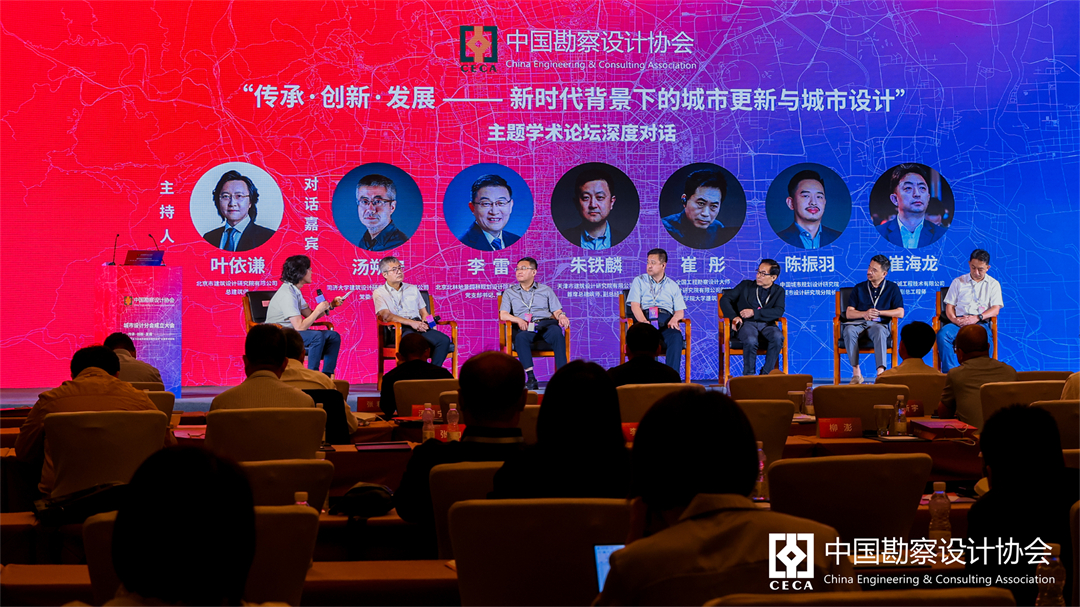 主題報告后,主持人與嘉賓進行了深度對話。同濟大學建筑設計研究院(集團)有限公司黨委書記、總裁湯朔寧,北京北林地景園林規劃設計院有限責任公司黨支部書記、董事長李雷,天津市建筑設計研究院有限公司首席總建筑師、副總經理朱鐵麟,全國工程勘察設計大師、中科院建筑設計研究院副院長、總建筑師崔彤,中國城市規劃設計研究院城市設計研究分院院長陳振羽,中冶京誠工程技術有限公司副總工程師崔海龍共同參與。六位行業領軍專家圍繞本次論壇的主題“傳承?創新?發展——新時代背景下的城市更新與城市設計”,針對行業技術地位、專業協同、人才培養、地域特色、城市雙碳等熱點問題,結合自身實踐經歷展開熱烈的討論,各抒己見,精彩紛呈,將論壇推向高潮。